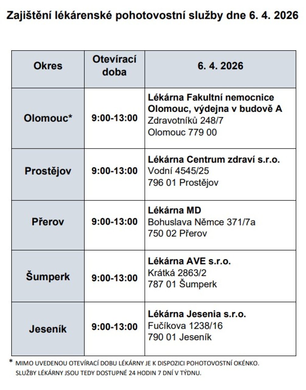 Pohotovost budou mít 6. dubna vybrané lékárny v Prostějově, Přerově, Šumperku i Jeseníku. Lékárna v olomoucké fakultní nemocnici má prostřednictvím výdejního okénka otevřeno v pohotovostním režimu nepřetržitě.