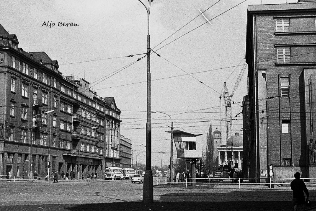Ještě doplňme, že v době pořízení snímku se ulice jmenovala nikoliv Legionářská, ale Spartakiádní, a od budovy Teplotechny na ni nenavazovala Studentská jako dnes, ale třída Lidových milicí.