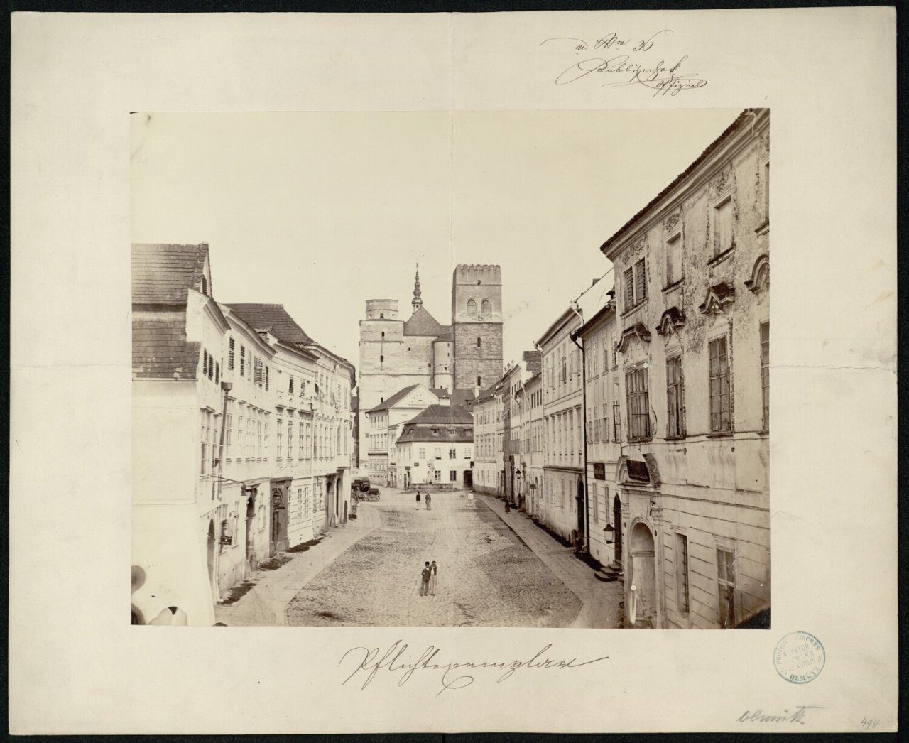 Pichler Photografisches Atelier Pichler & comp 1863, pohled na Českou ulici. Na snímku je vidět blok domů, který stával na místě dnešní Galerie Moritz před mořickým chrámem, a také krásný barokní dům po pravé straně, který na počátku 20. století ustoupil stavbě monumentální secesní stavby kina Edison, později Mír. | Zdroj: Moravské zemské muzeum v Brně