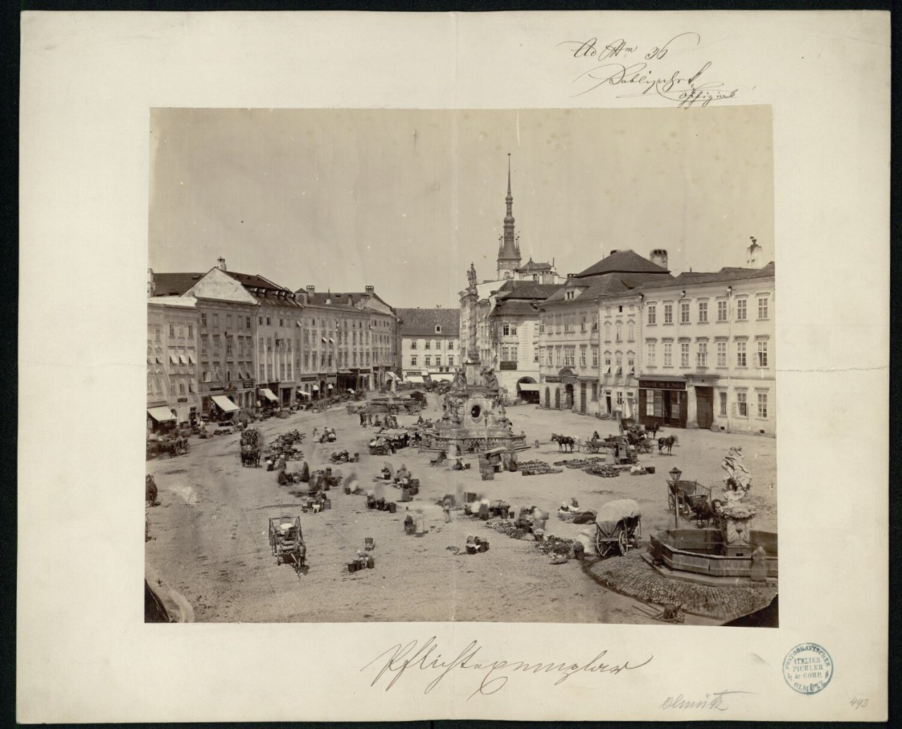 Dolní náměstí bývalo tradičně místem konání trhů. Na veřejném prostranství Horního náměstí se obchodovalo výrazně méně, známý je odsud Rybí trh a pak menší trhy v místech Caesarovy kašny. Dolní náměstí ale bylo tradičním místem pro běžné velké výroční trhy a jarmarky. | Pichler Photografisches Atelier Pichler & comp 1863 | Zdroj: Moravské zemské muzeum v Brně