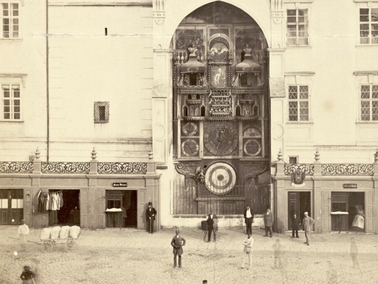 Krásná a důležitá fotografie ukazuje podobu orloje před novogotickou rekonstrukcí. Barokní tvář orloje, v té době mimochodem zřejmě nefunkčního, navazuje kompozičně na nejstarší, gotický orloj. Teprve novogotická přestavba v 90. letech 19. století původní rozvržení orloje z 15. století změnila. Vidíme také krámky v parteru radnice. Jak se zdá, vlevo od orloje bylo možné pořídit oděvy. | Pichler Photografisches Atelier Pichler & comp 1863 | Zdroj: Moravské zemské muzeum v Brně