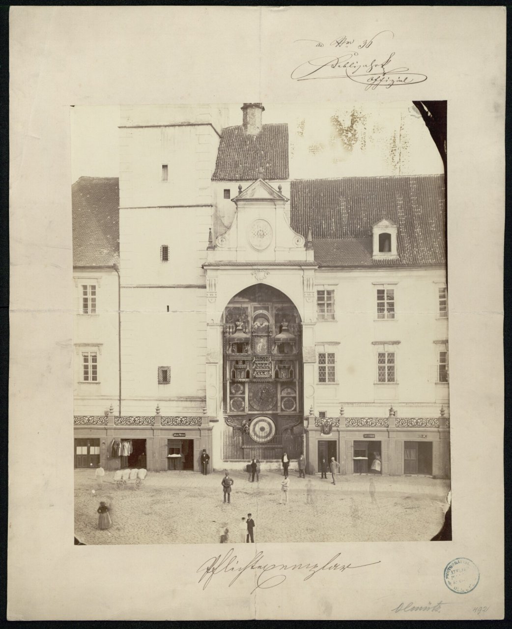 Krásná a důležitá fotografie ukazuje podobu orloje před novogotickou rekonstrukcí. Barokní tvář orloje, v té době mimochodem zřejmě nefunkčního, navazuje kompozičně na nejstarší, gotický orloj. Teprve novogotická přestavba v 90. letech 19. století původní rozvržení orloje z 15. století změnila. | Pichler Photografisches Atelier Pichler & comp 1863 | Zdroj: Moravské zemské muzeum v Brně