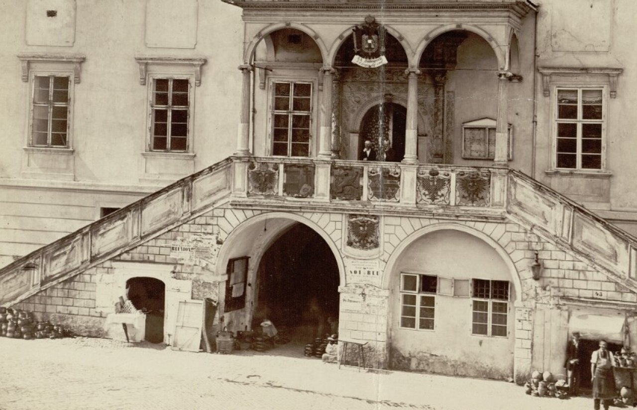 Na snímku renesanční radniční lodžie vidíme například doklad toho, že kamenné erby na lodžii bývaly v minulosti opravdu polychromované, tudíž je správné, že se radnice nedávno k této podobě znaků vrátila. Nad lodžií navíc visel ještě státní znak Rakouského císařství. V této době byla radnice sídlem soudu a státní správy, zatímco starosta a městská rada působili v protějším Edelmannově paláci. Zajímavý je i nabízený sortiment v místech dnešní restaurace Caesar, podle snímku to vypadá,m jak by se zde prodávaly hrnce, džbány a koše. | Pichler Photografisches Atelier Pichler & comp 1863 | Zdroj: Moravské zemské muzeum v Brně