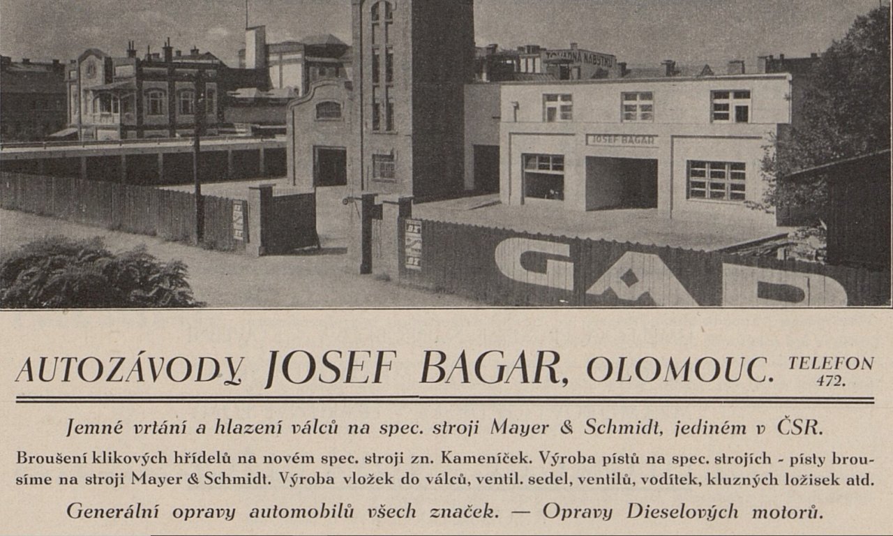 Velké moderní autodílny, garáže i prodejnu pro motoristy založil v Hodolanech ve třicátých letech pan Josef Bagar. Když po válce zemřel, přešel podnik na jeho mladšího bratra Adolfa Bagara, jinak právníka. Ten si ovšem vlastnictví autodílen po bratrovi dlouho neužil – po únoru 1948 mu byly zabaveny a znárodněny a nešťastný dědic skončil v uranových dolech. Opravárenské dílny pak místo něj provozoval příslušný národní podnik ČSAO.