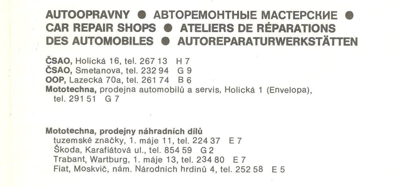 Například Mototechna na náměstí Národních Hrdinů nabízela podle informací na mapě města z počátku 80. let díly na vozy značky Fiat a Moskvič. Právě tato prodejna měla mimořádně dlouhou tradici. Už v březnu roku 1926, tedy hezkou shodou okolností přesně před sto lety, zde v tehdejším paláci Pozemkového ústavu otevřeli podnikatel Zatloukal a motoristický závodník Kroutil prodejnu s názvem Auto-Moto-Spol. Po únoru 1948 se po pánech sice slehla zem, ale Mototechnu bychom zde našli až do konce 80. let. Po ní pak zde dlouhá léta bývala olomoucká centrála cestovní kanceláře Čedok a dnes je tu pekařství a sázková kancelář.