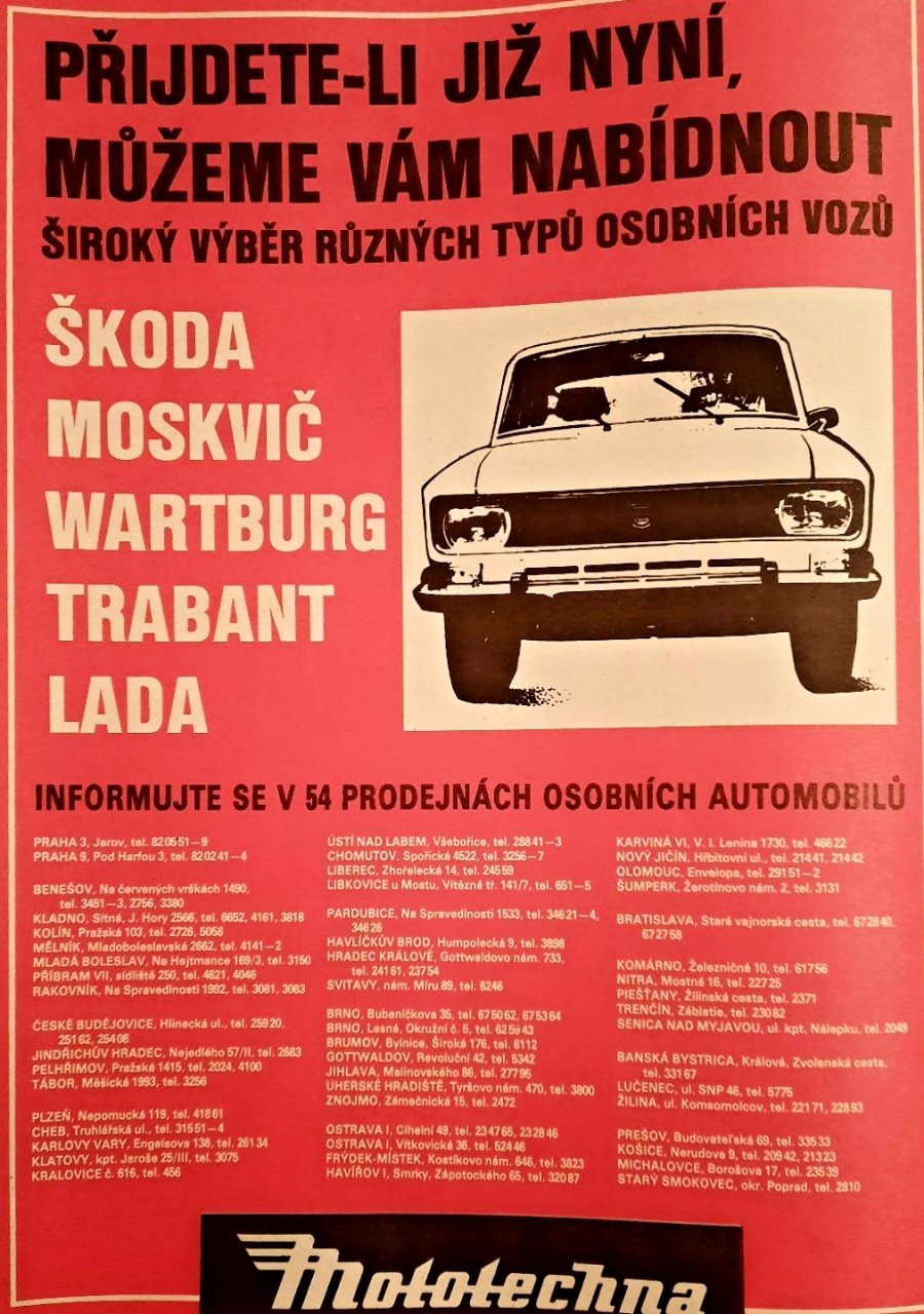 Reklama na služby a pobočky Mototechny z roku 1980