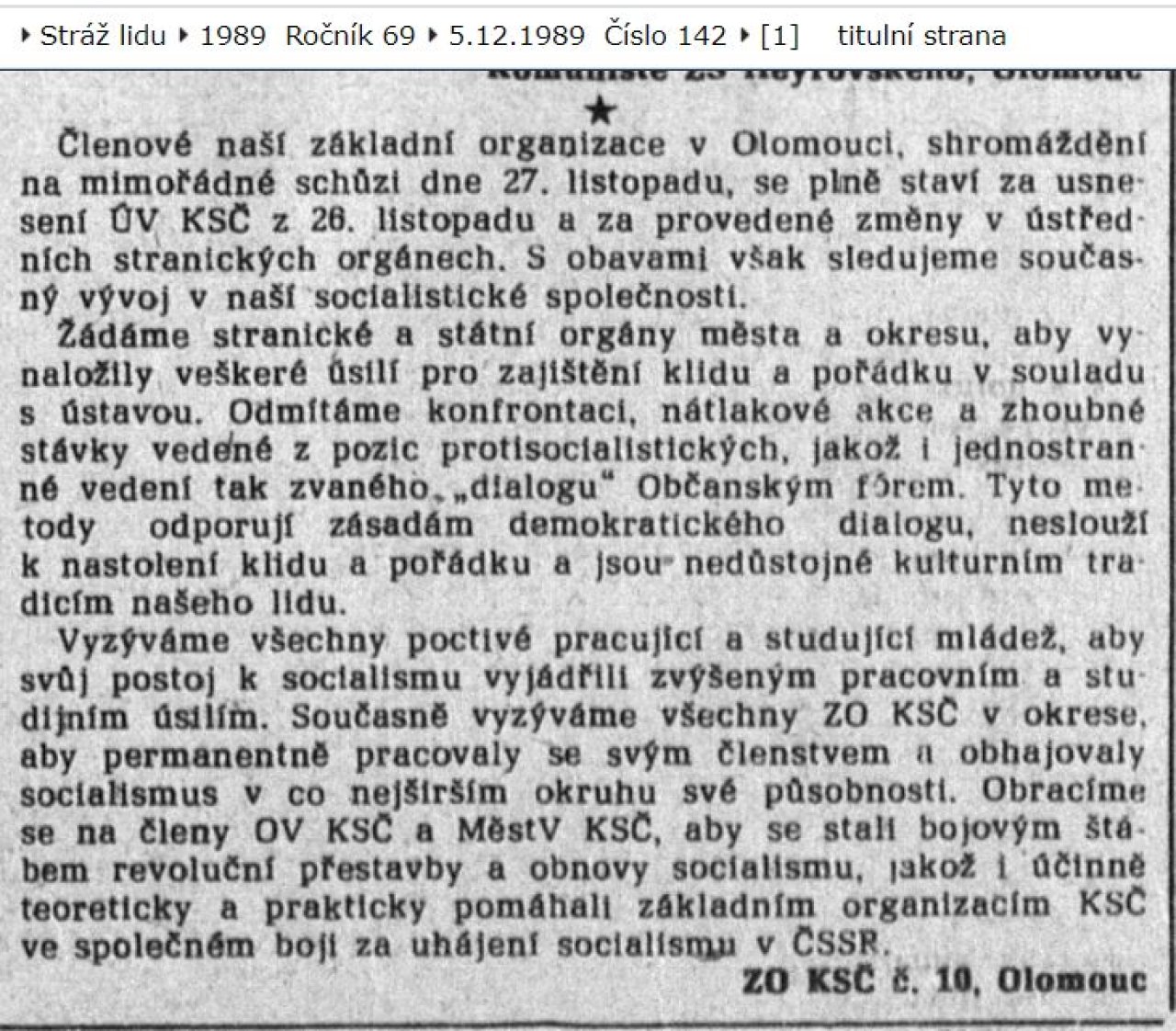 Jen pro lepší představu o tom, jak se totálně míjel starý s novým myšlenkovým světem: ještě 5. prosince 1989 se předseda Městského národního výboru Olomouc (tedy de facto starosta) soudruh Josef Votoček ve Stráži lidu chlubil, že město splnilo svůj celoměstský socialistický závazek, že bylo odpracováno 105 tisíc brigádnických hodin v „rámci investičních akcí Z“ a 205 tisíc brigádnických hodin v pomocných pracích v zemědělství, kolik akcí se uskutečnilo v oblasti „masové politické práce“ a jak vydařené byly oslavy 72. výročí Velké říjnové socialistické revoluce.
