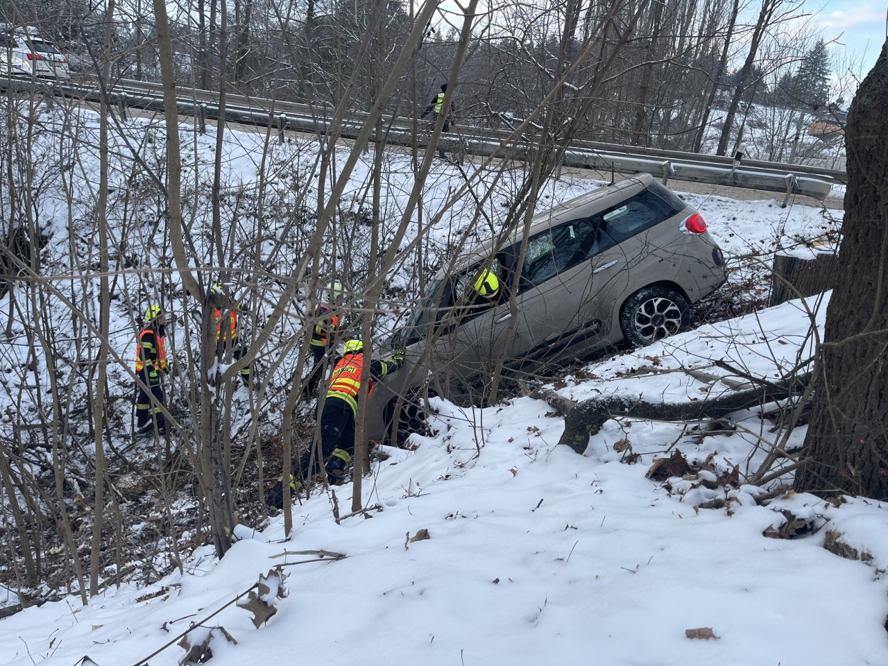 Další havarovaný osobní automobil hasiči vyprostili v sobotu odpoledne u Mostkovic na Prostějovsku. Při odbočování na příjezdovou cestu sjel na zasněžené a namrzlé silnici i s posádkou do jednoho z přítoků plumlovské přehrady a zůstal zaklíněný ve srázu mezi stromy, hrozilo jeho další zřícení.
