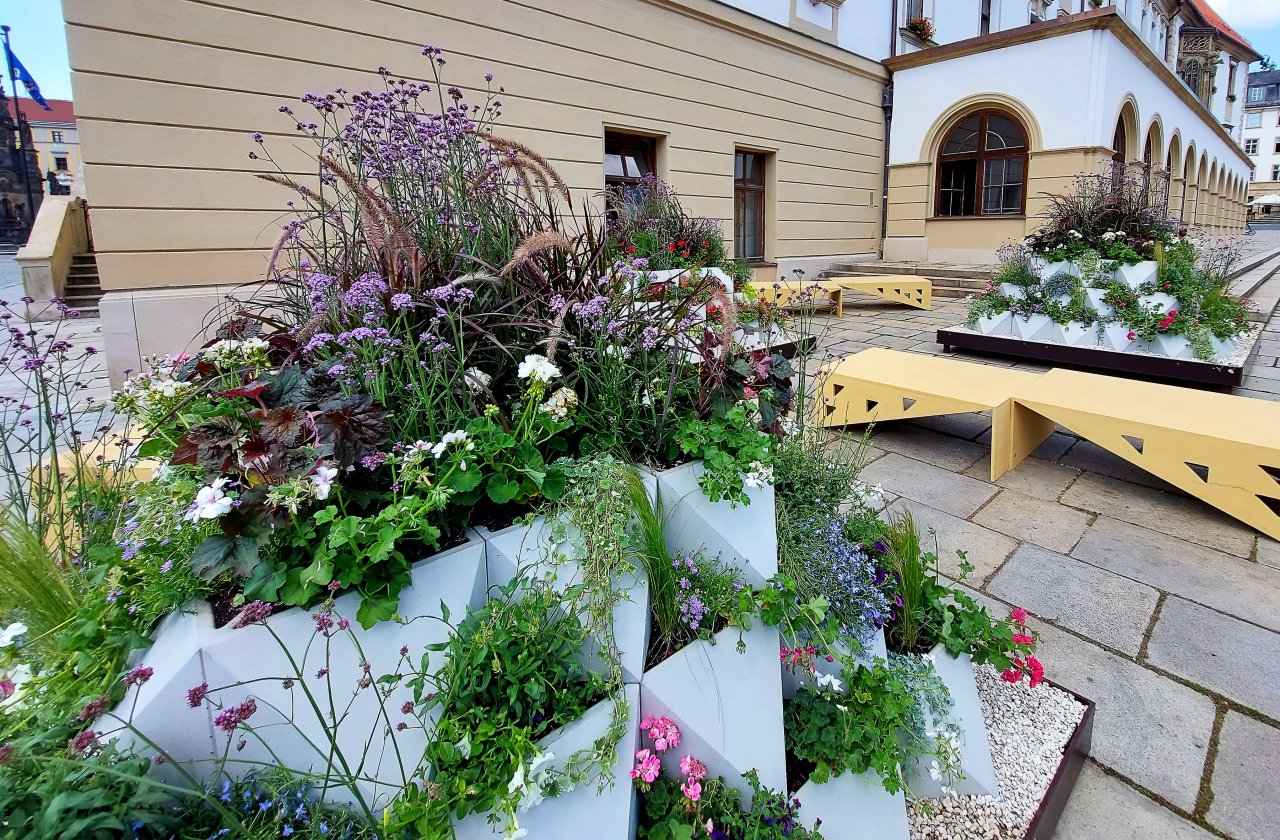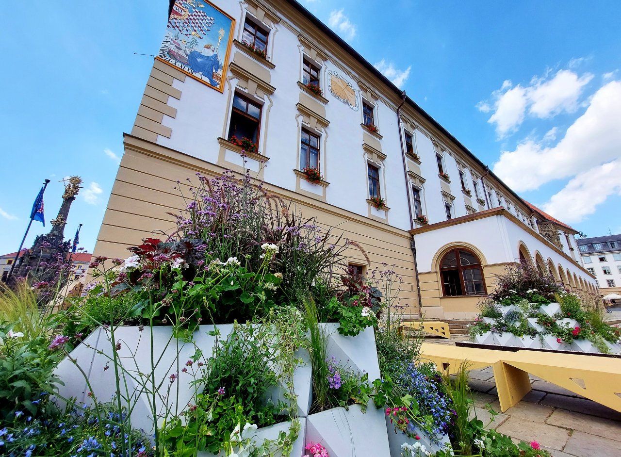 Na rohu radnice pod slunečními hodinami je nový green point. Ten loňský byl perfektní, lidé si ho okamžitě oblíbili a každý den tady byli k vidění lidé, jak na lavičkách mezi květinami třeba pracují na notebooku nebo prostě jen tak odpočívají. Letos je květinová výzdoba pojatá jinak, místa k sezení tu ovšem opět jsou, což je to podstatné. I tento green point si určitě najde znovu své uživatele.