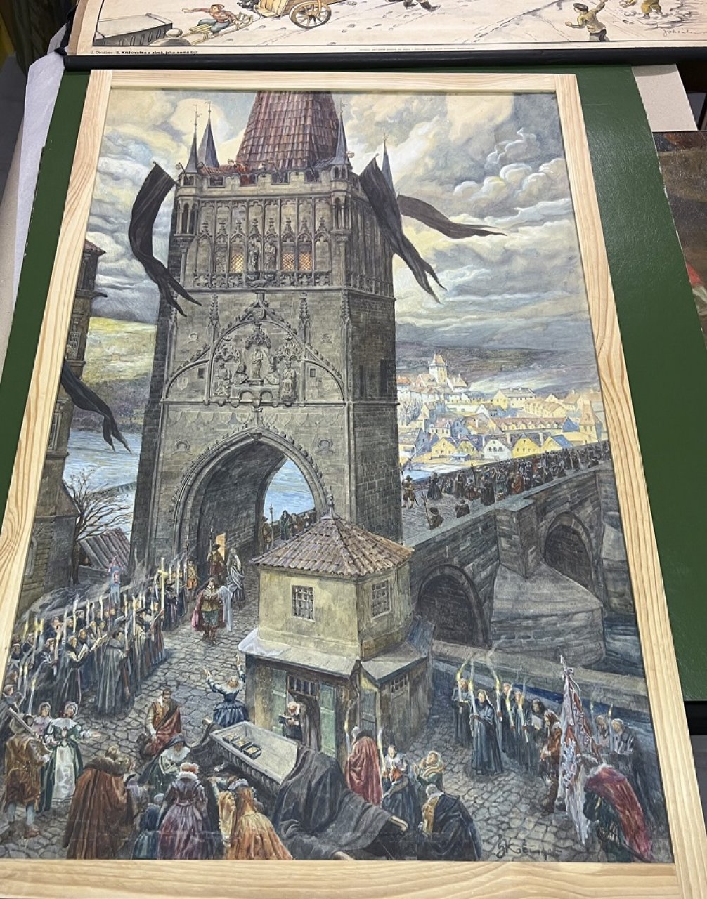 Jako příklad popsala obraz, který by možná některé citlivější povahy při hodině dějepisu dnes i vyděsil. „Připomíná velmi realisticky událost z roku 1631, kdy byly z mostecké věže Karlova mostu sňaty hlavy popravených účastníků stavovského povstání. Je to obraz z doby první republiky, kdy bylo toto téma vnímáno jako důležité. Šlo o dějepisnou pomůcku, ale z dnešního pohledu bychom ji už určitě nevyužili,“ pokračovala Jarmila Klímová.