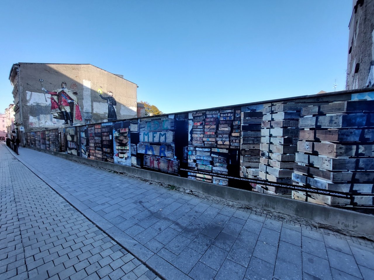 Nová podoba ohrady v Denisově ulici navazuje na probíhající výstavu BOSCH+BOSCH, která trvá do 23. října. Představuje aktuální tvorbu jedné ze členek jugoslávsko-maďarské skupiny BOSCH+BOSCH. V roce 1976 se dva její členové Bálint Szombáthy a Katalin Ladik vydali na cestu na Tenerife, kde postupně vytvořili dva umělecké cykly. Jedním z nich je série fotografií, v níž zaznamenávají drobné landartové zásahy ve formě nápisů z oblázků. Druhá série fotograficky dokumentuje přepravky na ryby objevené v městském přístavu.