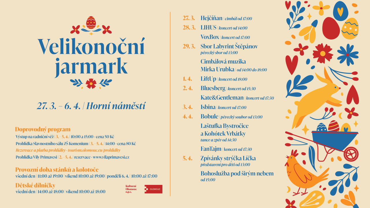 Součástí jarmarku bude také pestrý kulturní program, který nabídne koncerty, folklor i vystoupení pěveckých sborů. Zahajovací den 27. března zpříjemní cimbálová muzika Hejčíňan od 17 hodin. V dalších dnech vystoupí například kapely LIHUS, VoxBox, LiftUp, Bluesberg, Kate&Gentleman, Isbina nebo FanTajm. Program doplní také folklorní soubory a pěvecké sbory, například Sbor Labyrint Štěpánov či soubory Laštufka Bystročice a Kohótek Vrbátky.