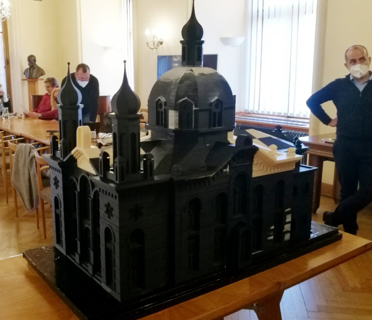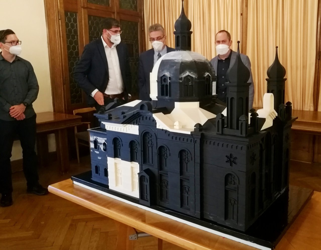 Objekt je vytištěný z kvalitního ASA materiálu. Z kombinace černé a bílé barvy je pouze proto, že se jedná o drahý materiál, který byl navíc během výroby obtížně dostupný. Výsledný produkt následně poslouží ve slévárně pro výrobu finálního bronzového modelu synagogy. Ten bude stát na kamenném soklu na Palachově náměstí a spolu s vysokou kamennou stélou má připomínat nádhernou olomouckou synagogu, zničenou v březnu 1939 olomouckými nacisty.
