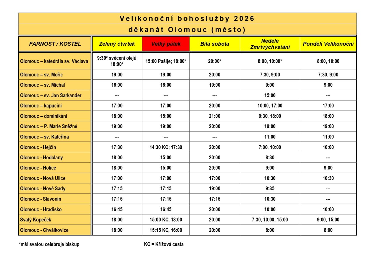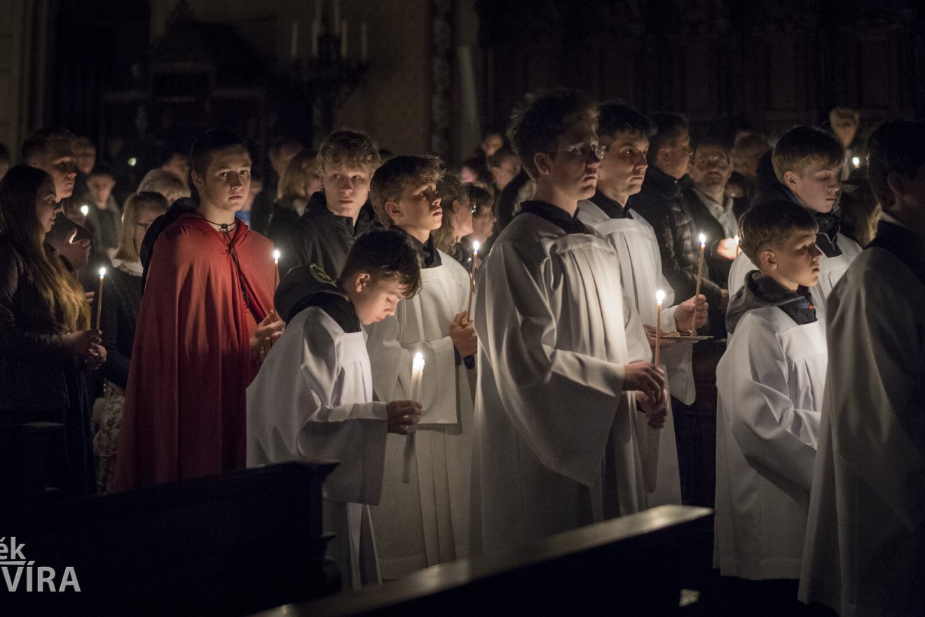 Bílá sobota (letos 4. dubna) je znamením Ježíšova přebývání v hrobě. Večer po setmění se slaví předvečer (vigilie) nedělní slavnosti Zmrtvýchvstání Páně. Při této mši svaté se světí oheň a svíce (paškál), čtou se biblické pasáže o dějinách vykoupení, rozeznívají se zvony i hudba, světí se voda a uděluje svátost křtu čekatelům (katechumenům). V Olomouci se, stejně jako kdekoliv jinde v katolickém světě, konají večerní mše za specifické atmosféry. Nejprve před kostelem probíhá svěcení ohně, následně věřící vstupují do potemnělého chrámu, v němž září pouze svíce.