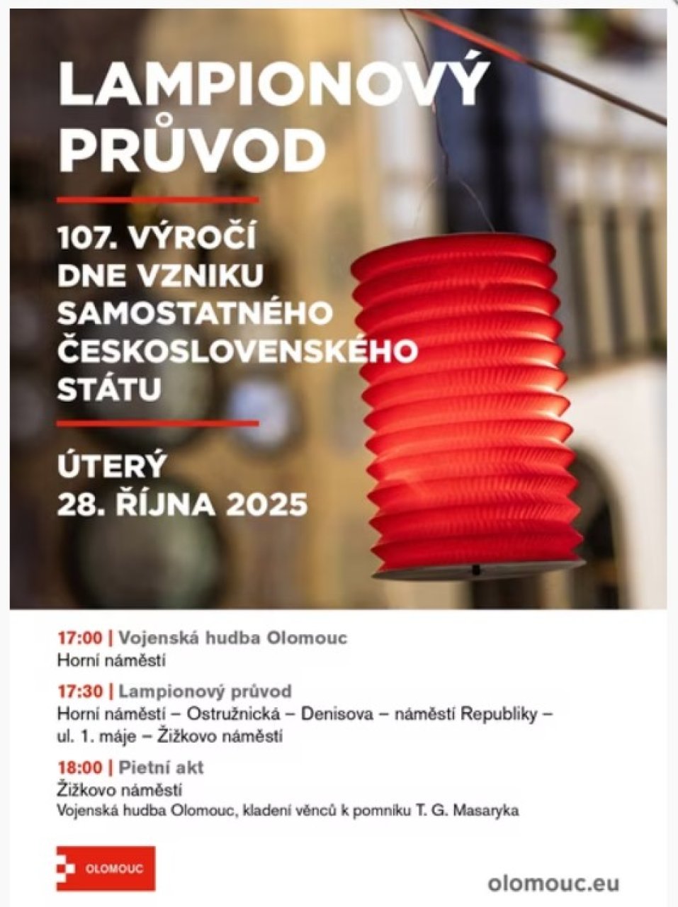 Program zahájí v 17 hodin vojenská hudba na Horním náměstí. Průvod se dá do pohybu v o půl hodiny později po trase: Horní náměstí – Ostružnická – Denisova – náměstí Republiky – 1. máje – Žižkovo náměstí a můžete se k němu kdekoliv připojit.
