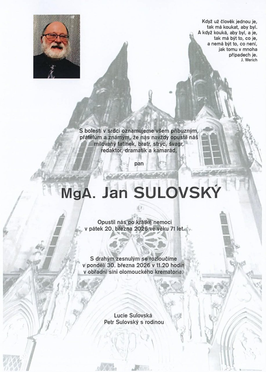 V roce 2009 získal Cenu Olomouckého kraje za výjimečný počin v oboru profesionálního divadelního umění. Odchod Jana Sulovského znamená ztrátu výrazné osobnosti, která dlouhodobě spoluutvářela kulturní život Olomouce i celého regionu.