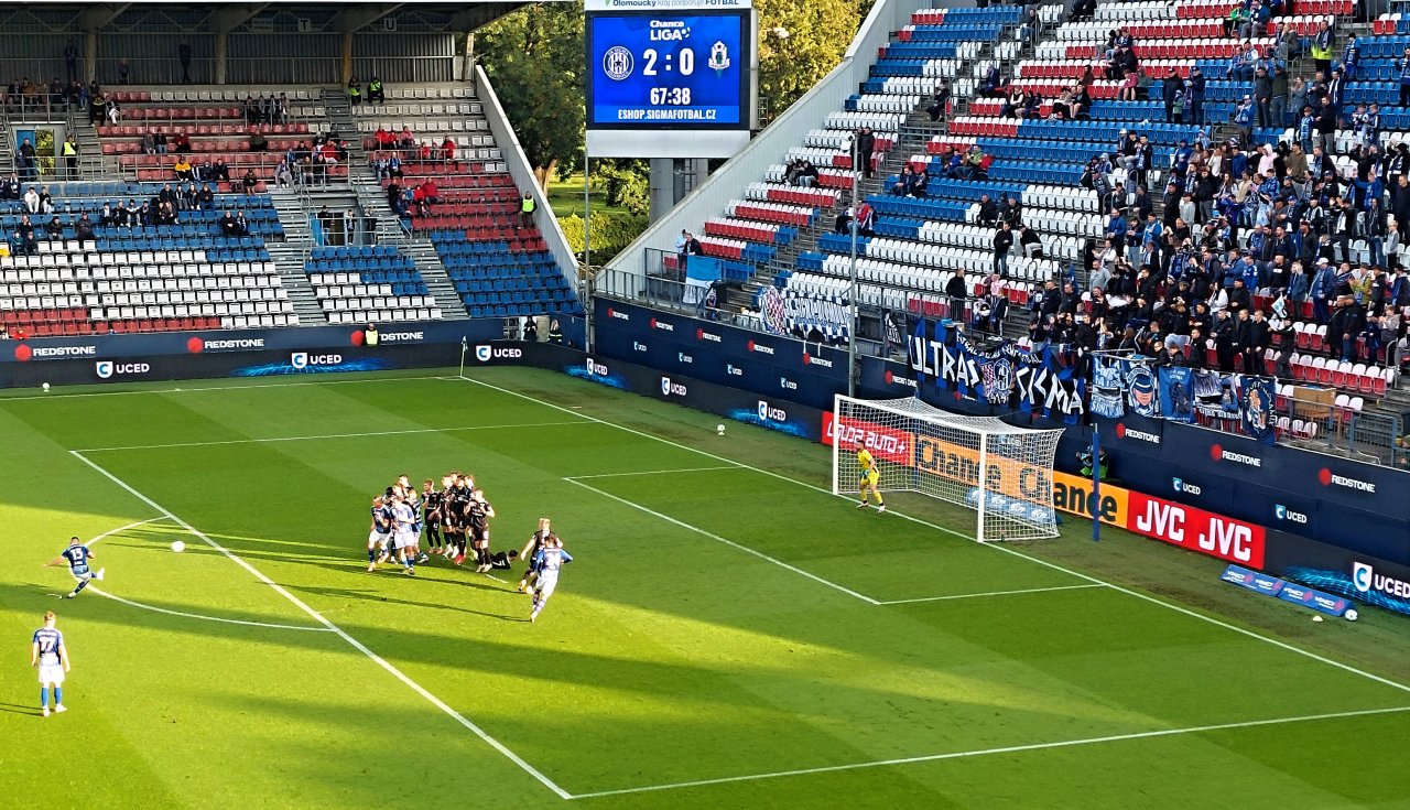 Třetí úder mohl Jablonci nadělit Jiří Sláma. V 68. minutě si vzal na starost přímý kop. Jeho elegantní ránu však zastavilo břevno. Hanáci se následně rychle zmocnili míče, do zakončení se ještě dostal Mikulenka, tentokrát však minul bránu.