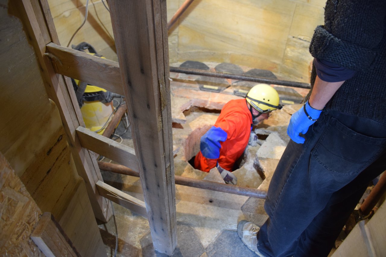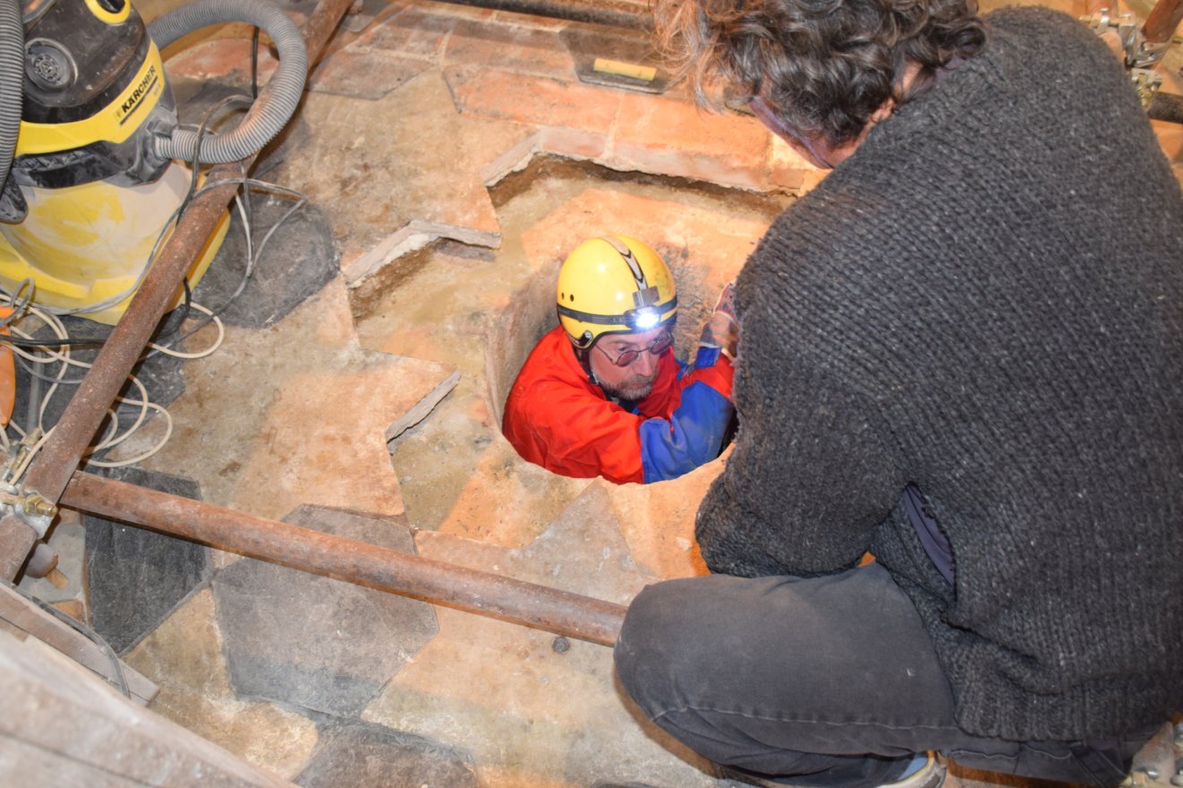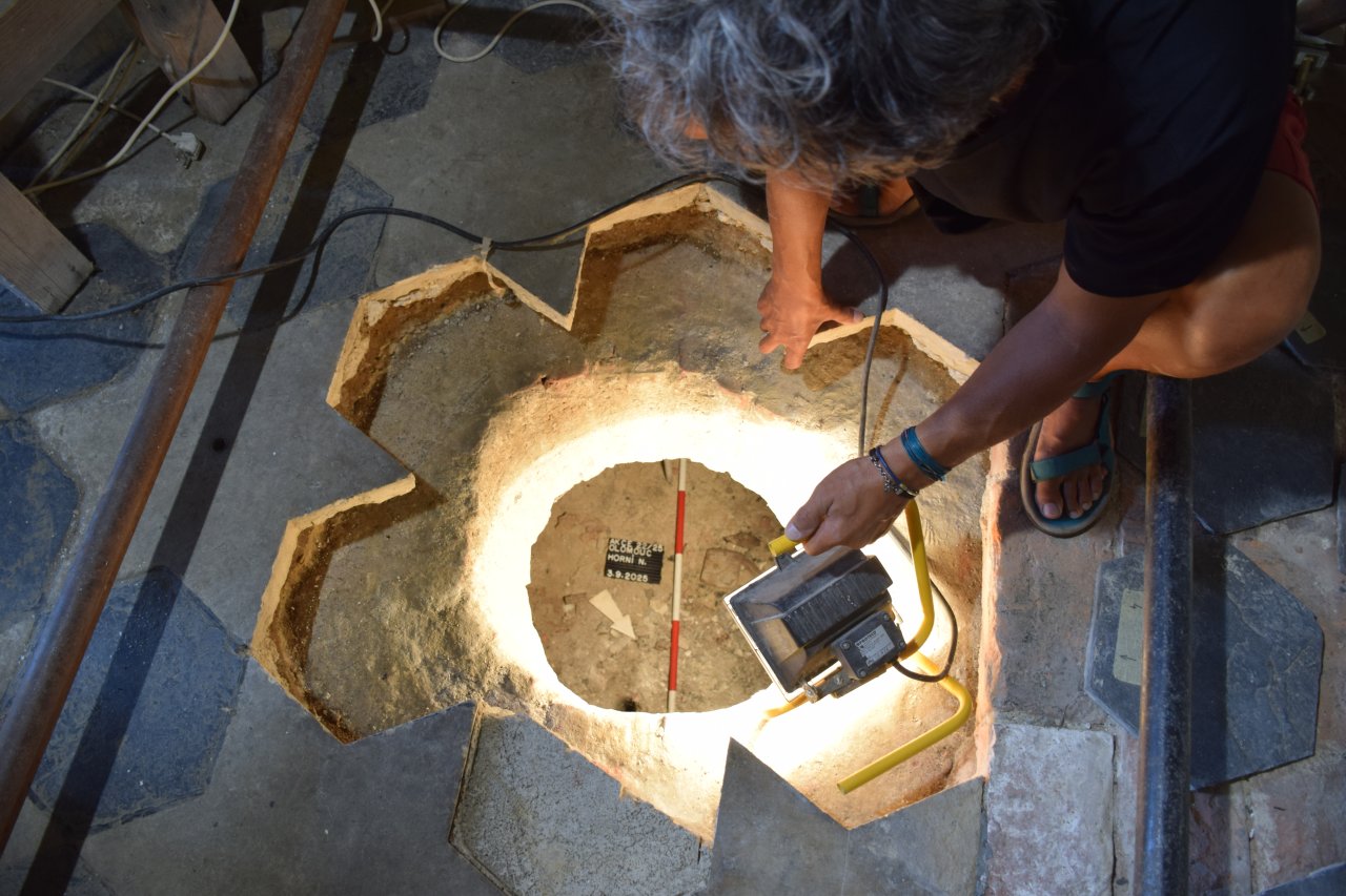 O existenci podzemního prostoru pod podlahou kaple uvnitř sloupu se vědělo už od předchozího restaurování památky v roce 1999 až 2001. Jenže nikdo neměl bližší informace o tom, k čemu tajemná dutina sloužila. Letos v květnu se povedlo dostat k jejímu vstupu. A v září se do úzkého otvoru spustil jeden z památkářů, archeolog Richard Zatloukal.