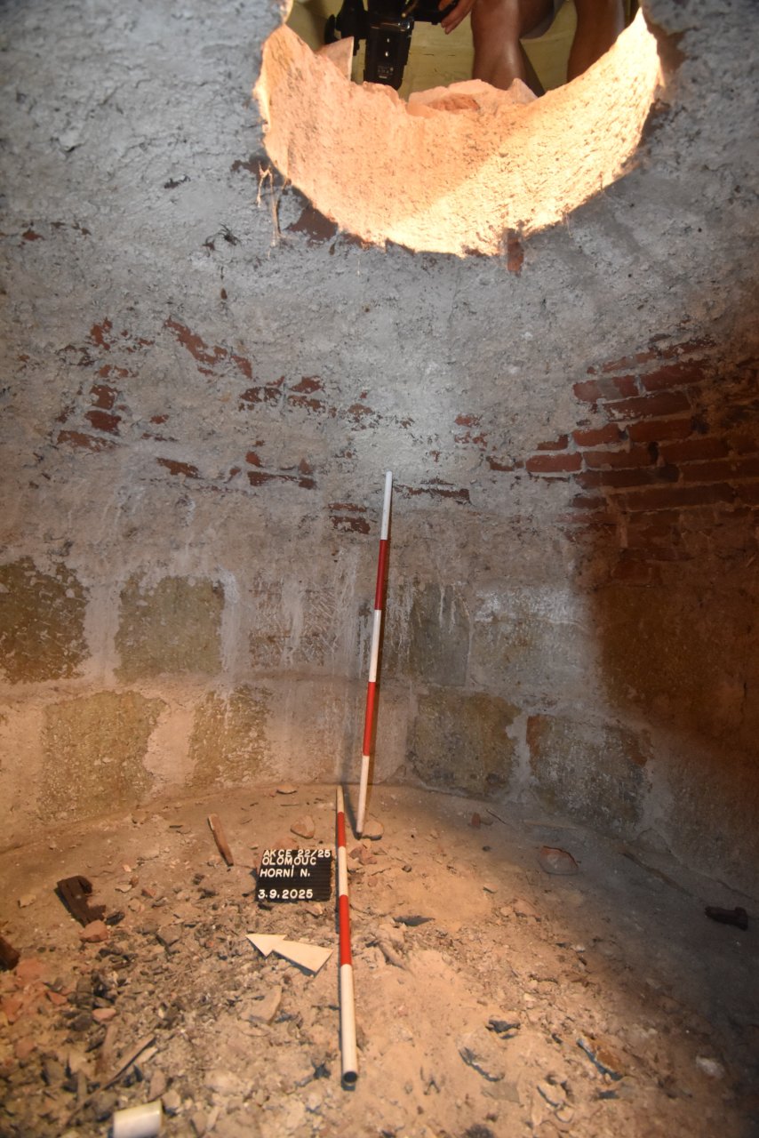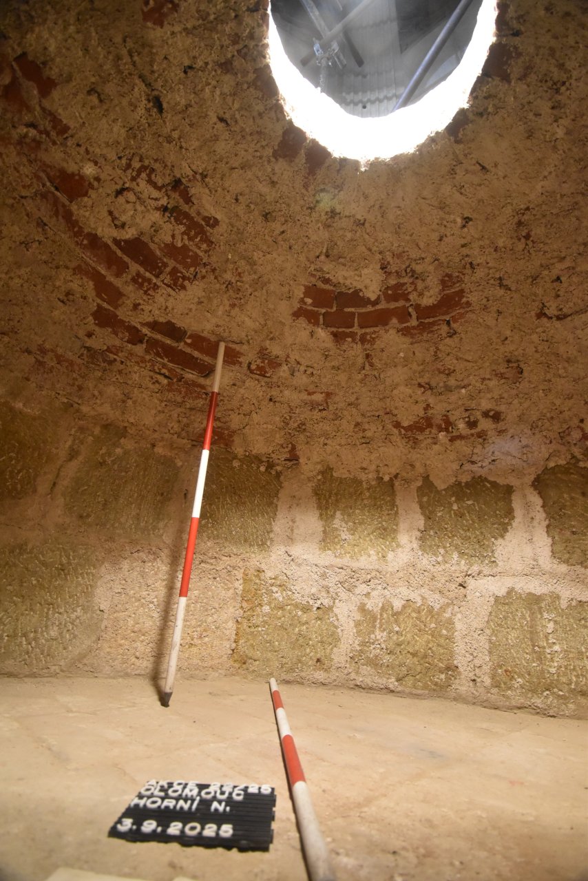 Do záhadného prostoru o kónickém tvaru s úzkým vstupem slezl Richard Zatloukal, archeolog z Národního památkového úřadu, územního pracoviště v Olomouci. Prostor pod podlahou má následující rozměry: kruhový půdorys o průmětu 209 centimetrů je zaklenut cihlovou klenbou tloušťky 26 centimetrů se středovým kónickým otvorem 45 centimetrů, dosahuje výšky 127 centimetrů k intradosu a 154 centimetrů k extradosu. Pod klenbou spočívají dva prstence hrubě opracovaných bloků o rozměrech 37 × 37 centimetrů z maletínského pískovce, pod nimiž leží cihlová podlaha.