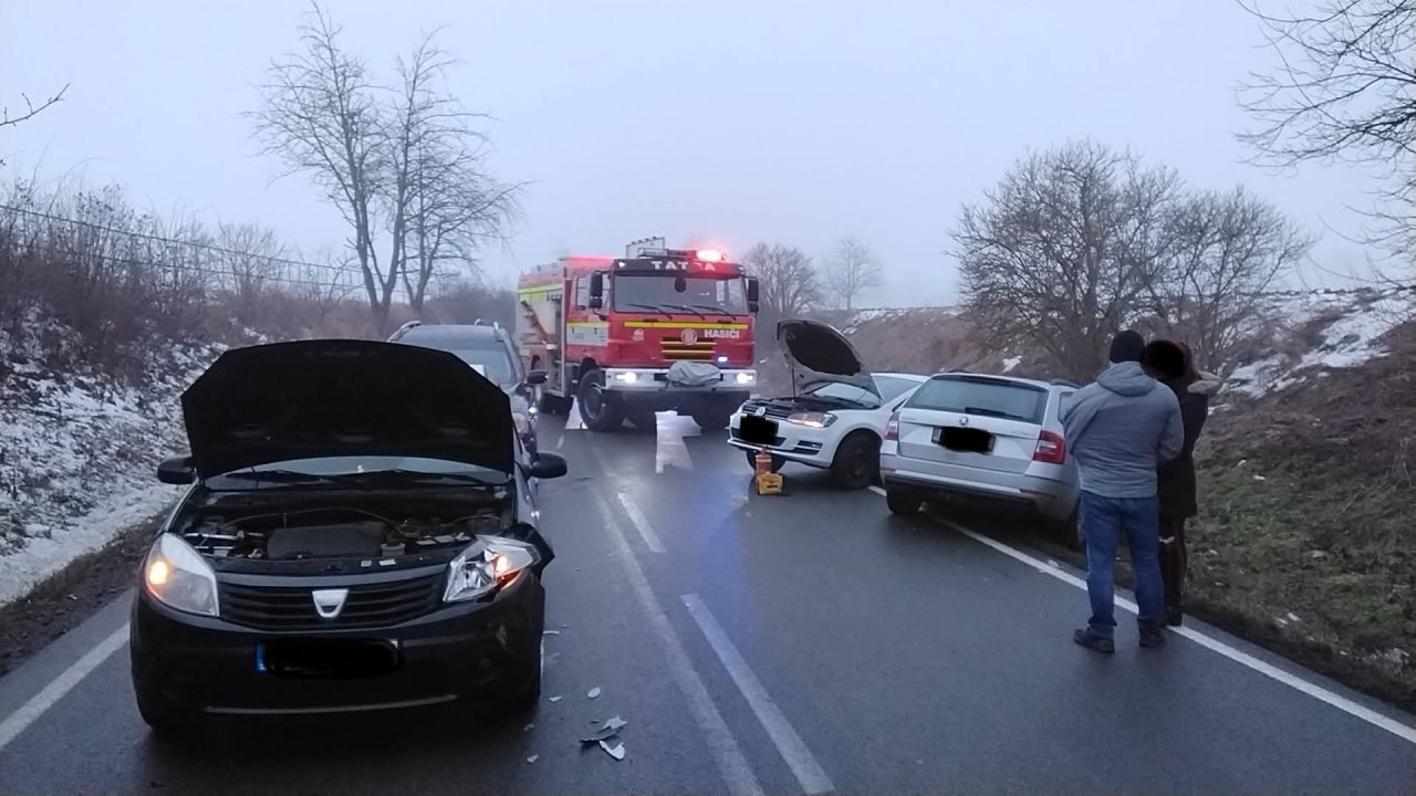 Hromadná nehoda se stala u Hněvotína, kde se v rozmezí 500 metrů srazilo celkem šest a následně osm aut. Tato hromadná srážka se obešla bez vážných zranění.