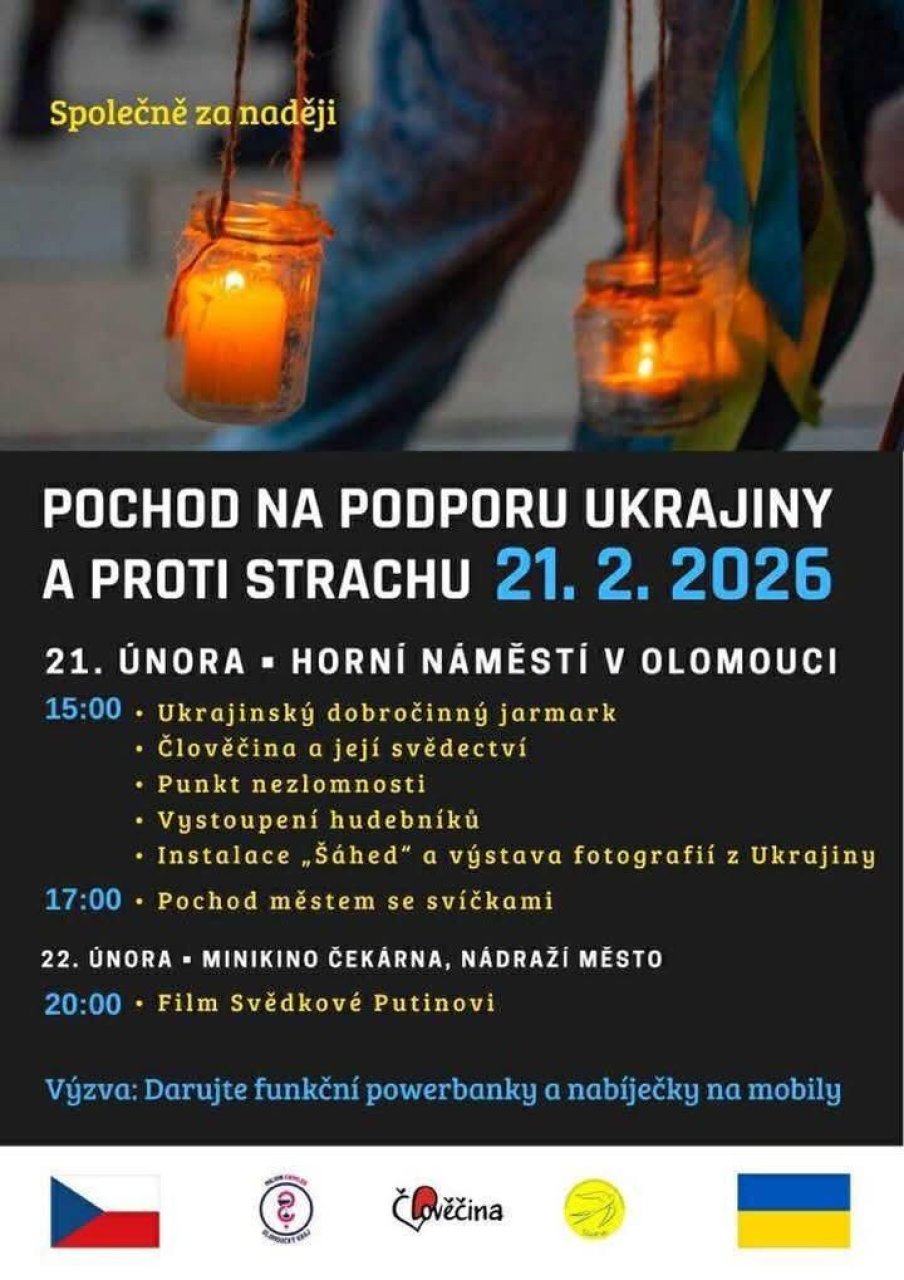 „Čtyři roky od začátku plnohodnotné ruské invaze se znovu setkáme, abychom ukázali, že Ukrajina v tom není sama,“ uvedla za spolek Člověčina organizátorka Dagmar Lenertová. Příchozí pak vyzývá, aby donesli funkční powerbanky a nabíječky mobilních telefonů, aby pomohly tam, kde je potřeba.