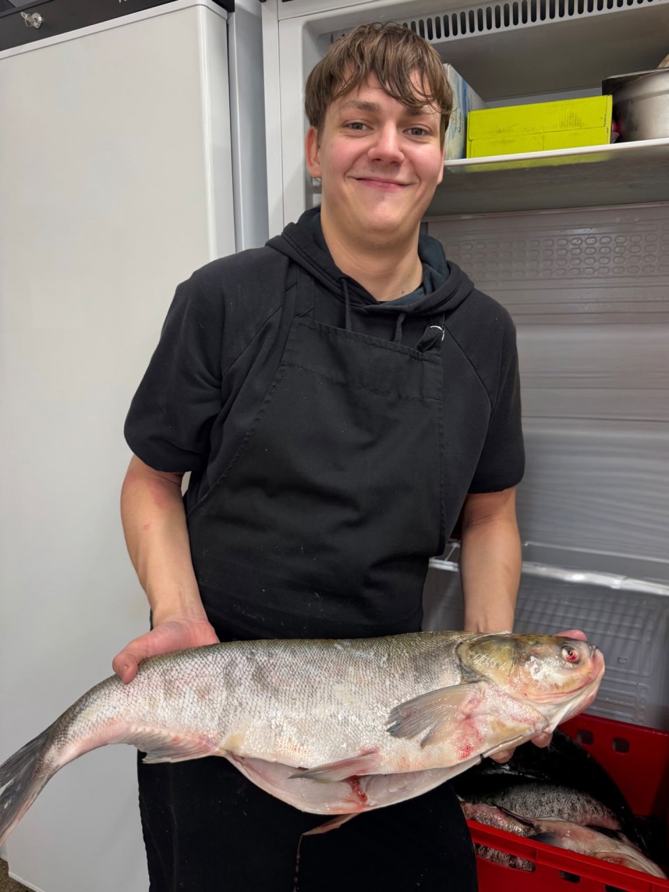 - Uzený tolstolobik s jarním bramborovým salátem a ředkvičkami.